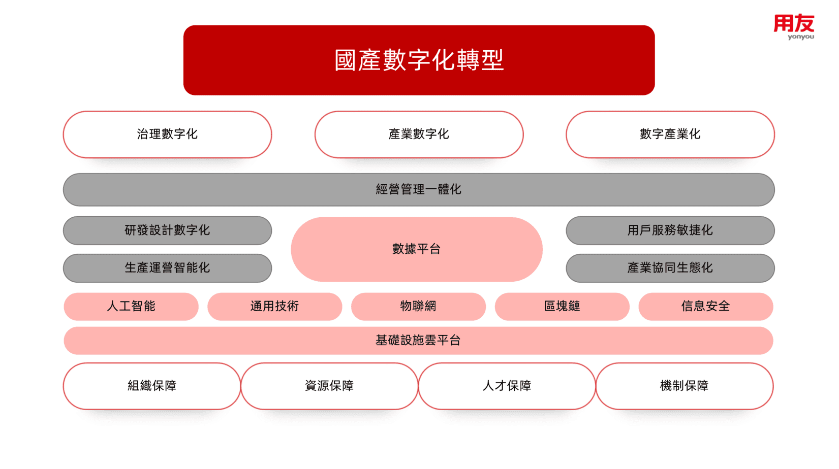 結合當前國有企業IT建設的基礎與數字化轉型的訴求與方向,用友認為國企數字化轉型應圍繞治理數字化、產業數字化和數字產業化三個轉型方向展開,以大數據、通用技術、人工智慧、物聯網、區塊鏈、基礎設施雲及資訊安全七類核心技術平台支撐經營管理一體化、研發設計數字化、生產運營智能化、用戶服務敏捷化、產業協同生態化五大業務能力的構建,並輔以組織、機制、人才、資源四方面的有效保障。